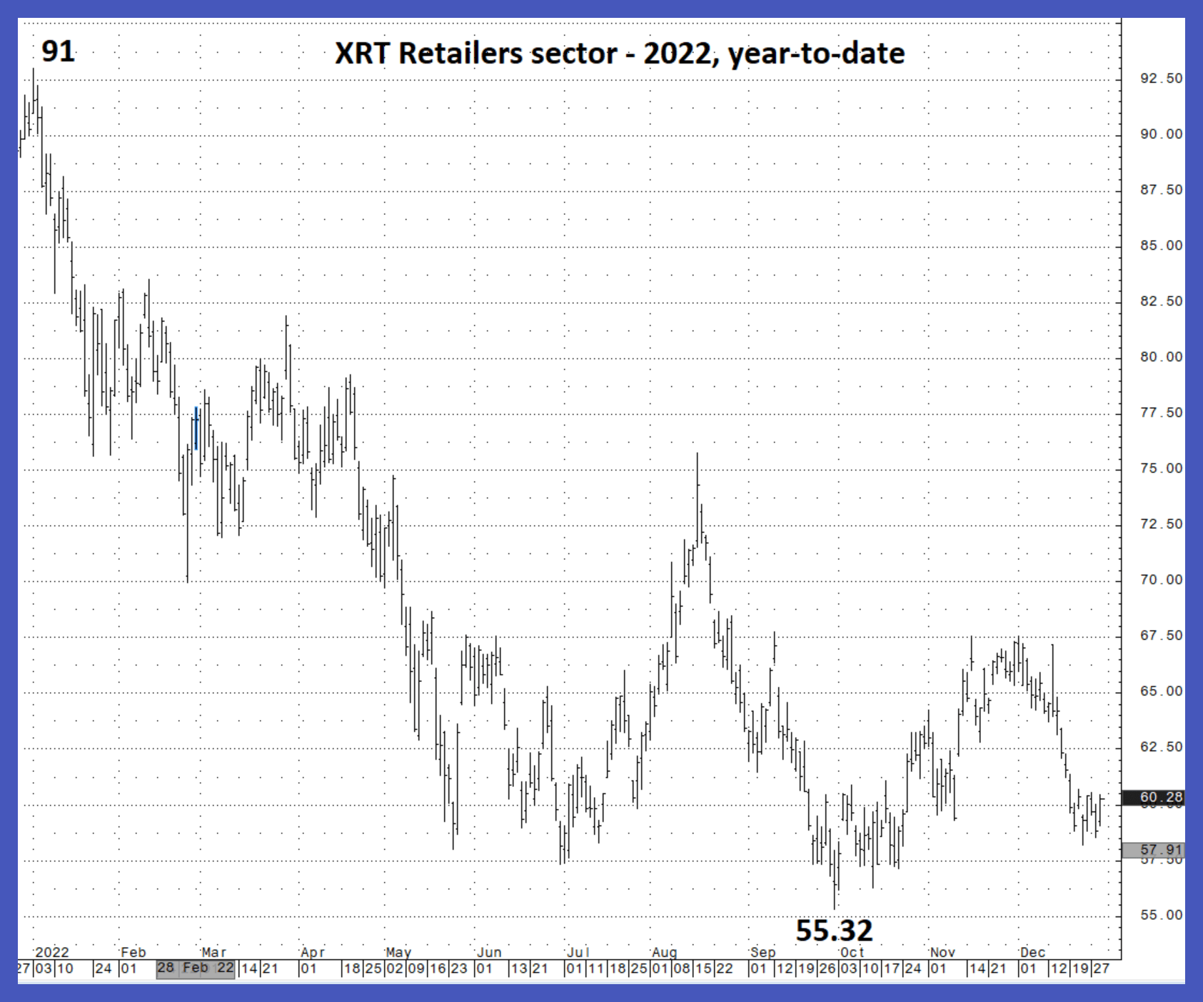 Retailers endured particular pain. Not only did many Retailers languish because of a weakened Consumer customer base, but they also struggled to persevere in an era of dominance by just a select few online commerce firms, especially Amazon and Walmart. Below is the chart of the Retailer sector using XRT. This ETF melted down a staggering 33% in 2022.