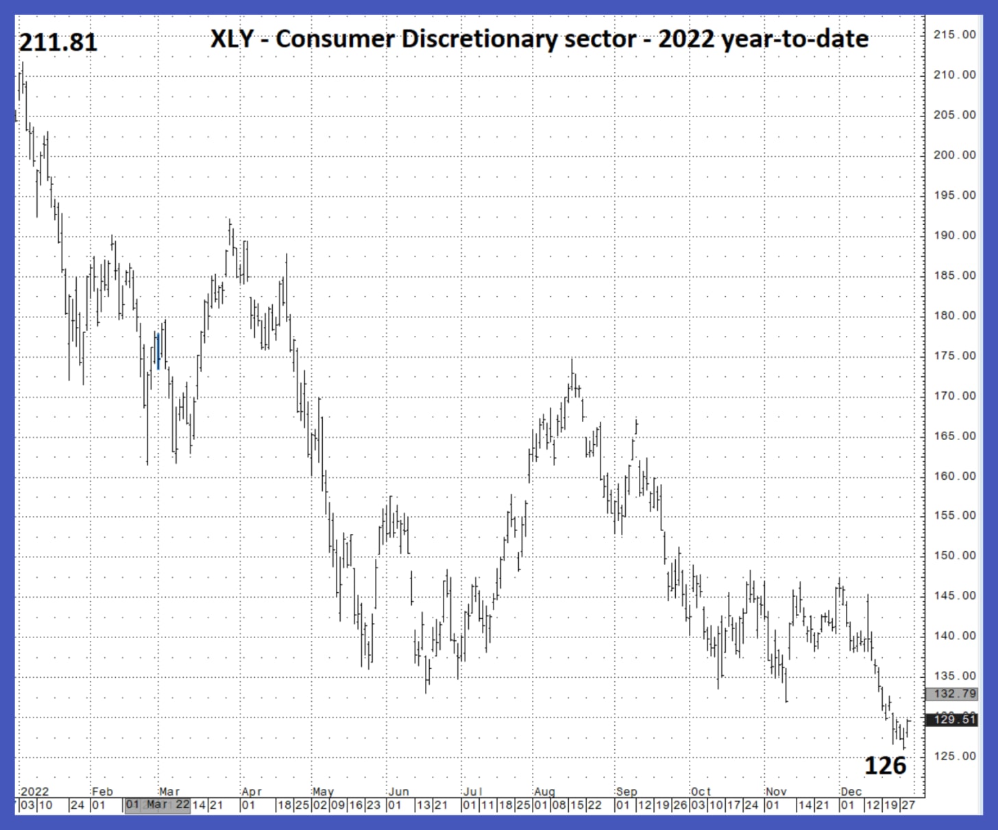That collapse in confidence naturally led to pain for Consumer-facing companies as well. Capital Markets suffered a horrific year overall, but Consumer names fared the worst. Here is a chart of the Consumer Discretionary Sector using the XLY, an ETF (exchange traded fund) that combines dozens of key companies into one ticker. Note the consistent downtrend all year, resulting in year-to-date whopping losses of -37%.