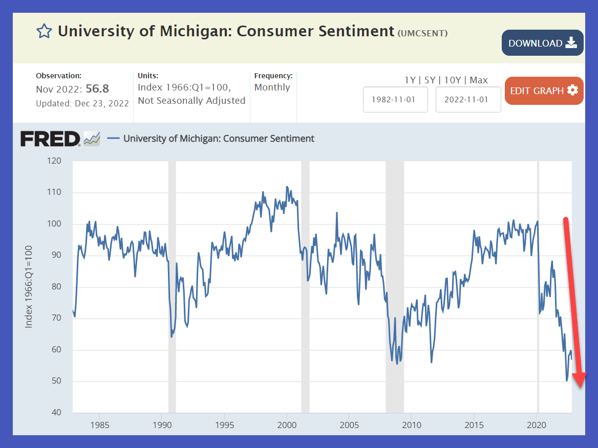 Americans endured a year of economic misery in 2022, as proven by dreadful Main Street economic trends plus plunging capital markets. It was truly an economic “Annus Horribilus” and points to further pain ahead in 2023 unless aggressive policy reforms begin. In 2022 citizens faced the toxic combination of fast-rising prices for the essential goods and services of life alongside a materially slowing growth trajectory. In fact, Real Wages — meaning personal incomes adjusted for inflation — have now declined a stunning 20 straight months. This longest-ever streak of wage depression compels citizens to cope with a massive spike in credit card debt. In fact, dangerous, high-interest credit card balances soared higher in 2022 at the fastest clip in two decades. Given precarious household budgets, it is little wonder that Consumer Confidence tanked. The widely watched University of Michigan survey of consumer sentiment reached the lowest level in the post-WWII era. Biden and his policies sent confidence lower than during the 1970s Oil Embargo, the Dot-Com Crash, and the 2008-09 Credit Crisis. Here is the chart, showing data back 40 years: