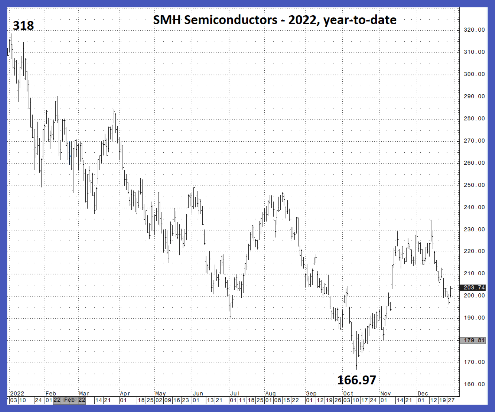 But the pain did not stay confined to just the Consumer side of the economy. Industrial enterprises also suffered, including the key Semiconductor space. Here, note the pain in the Chip sector, via SMH. The group shed a staggering 34% of its market value in 2022.