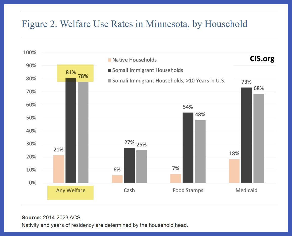 Somali migrants to America generate foreboding headlines lately, as the prime perpetrators in the largest fraudulent theft of public money in American history. But even aside from criminality, in Minnesota, a staggering 81% of Somali migrants receive government welfare benefits. Incredibly, even after a full decade or more in our country, that percentage only ticks down to a still-appalling 78%.